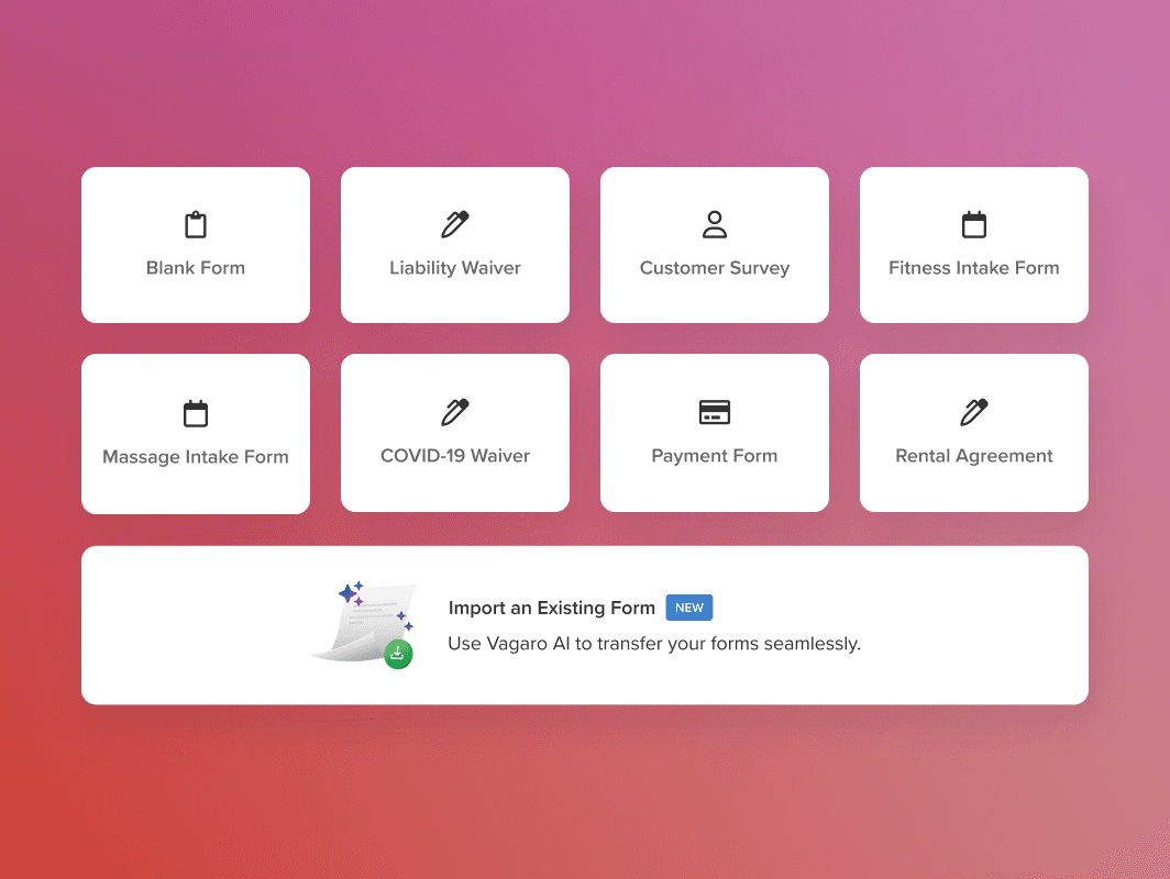 Make online booking easier with custom forms—collect info, photos, card details, and signatures right when clients book. Save time by importing external forms automatically with Vagaro AI, no prompt needed.