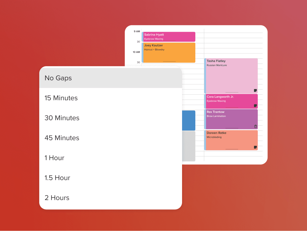 Keep your day running smoothly by reducing down time between appointments. With Minimise Gaps, Vagaro automatically groups available time slots around existing bookings. Cluster scheduling helps you stay optimized, see more clients, and maximize every hour.