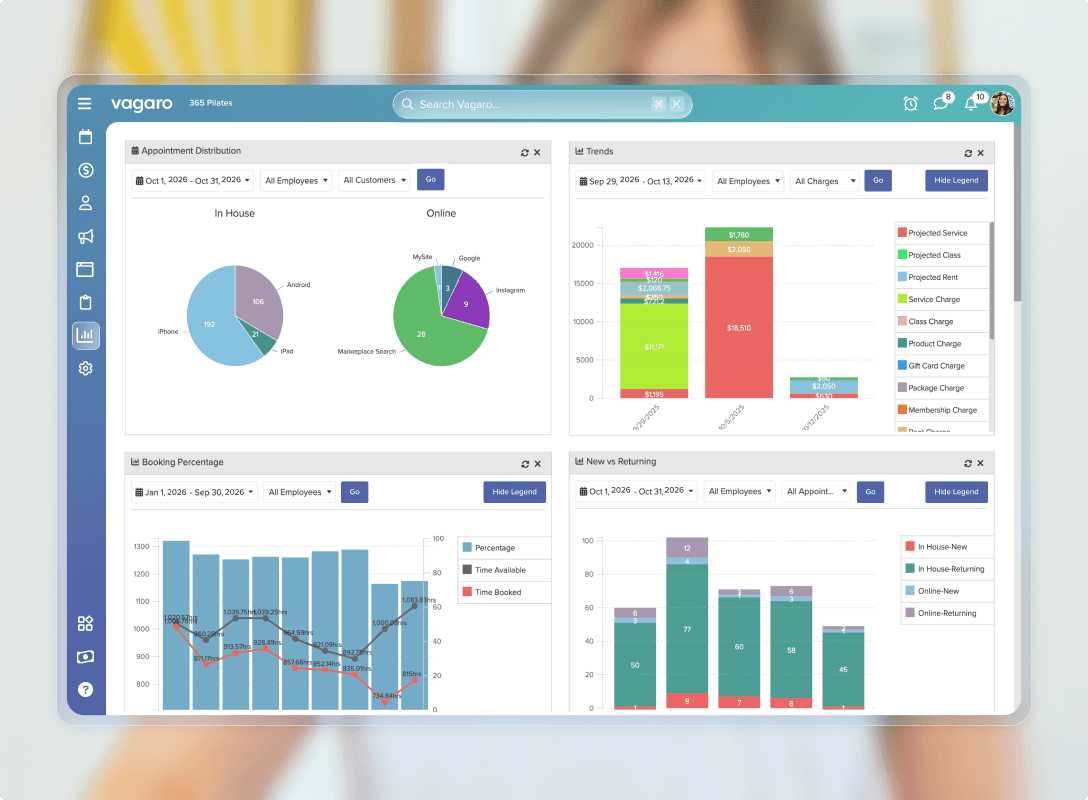 Keep your fingers on the pulse of your pilates studio with in-depth reports on business growth, team performance, and customer retention.