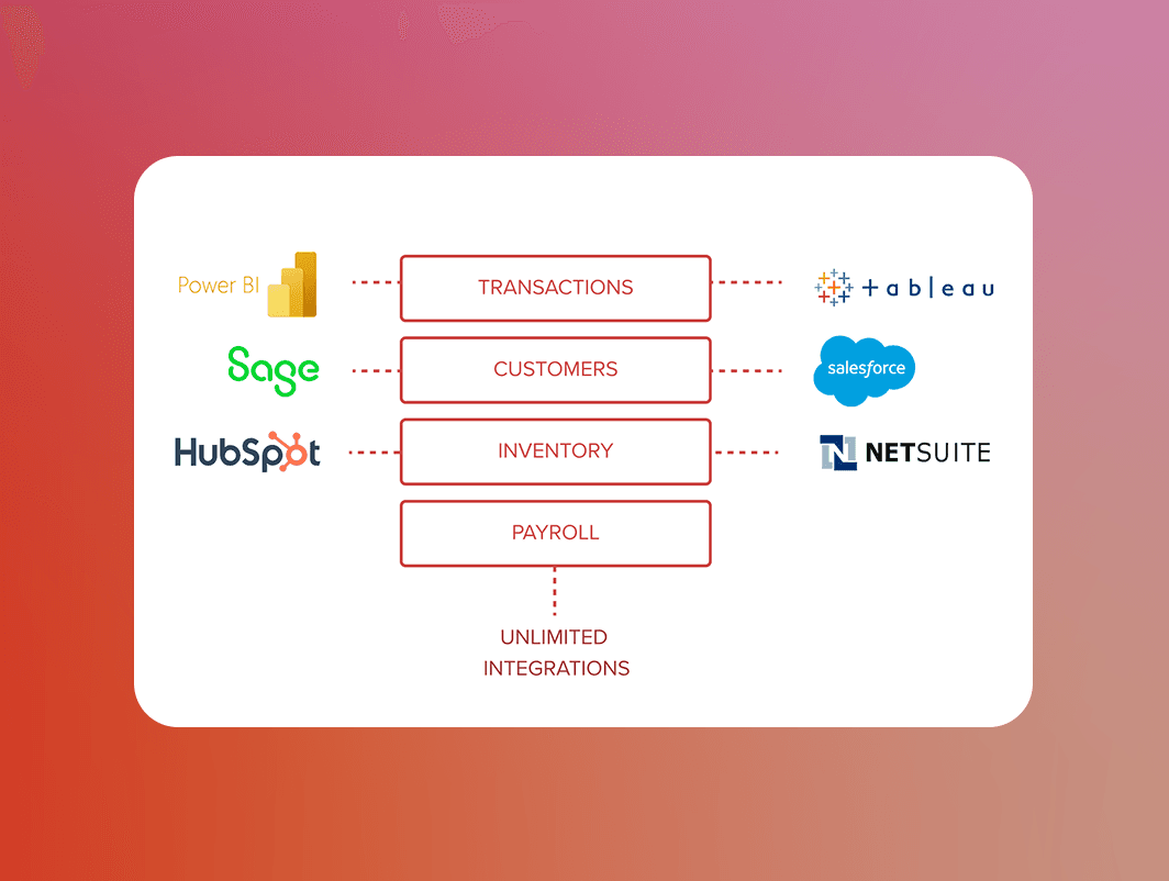 Connect Vagaro data to your own data warehouse and create custom visualizations in Power BI, Sage, HubSpot, Salesforce, Tableau, NetSuite & more.
