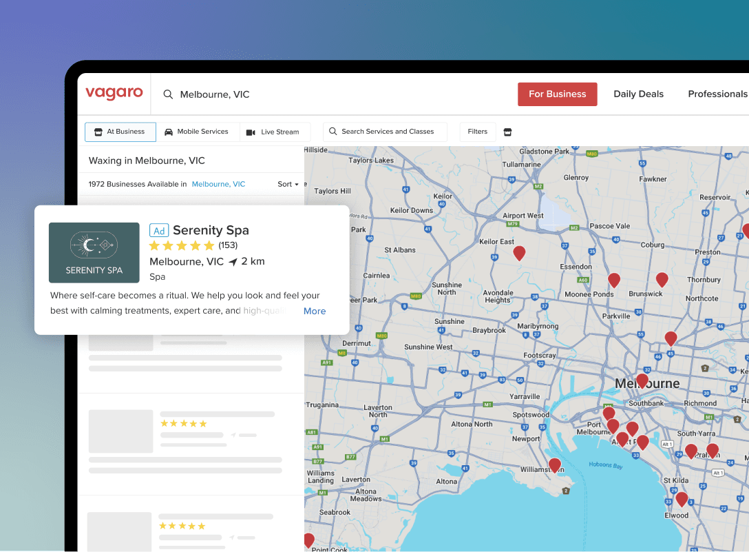 Get discovered by thousands of new clients searching for spa services and boost bookings through Vagaro’s high-traffic marketplace for spas.